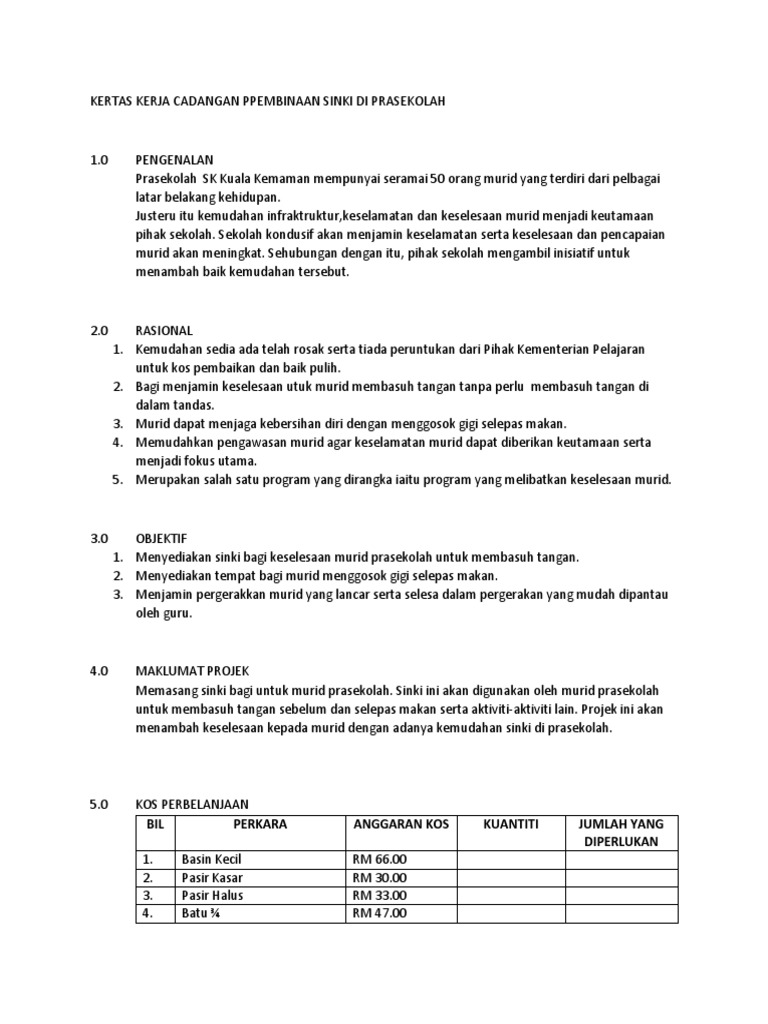 Kertas Kerja Cadangan Pembinaan Sinki Di Prasekolah Pdf